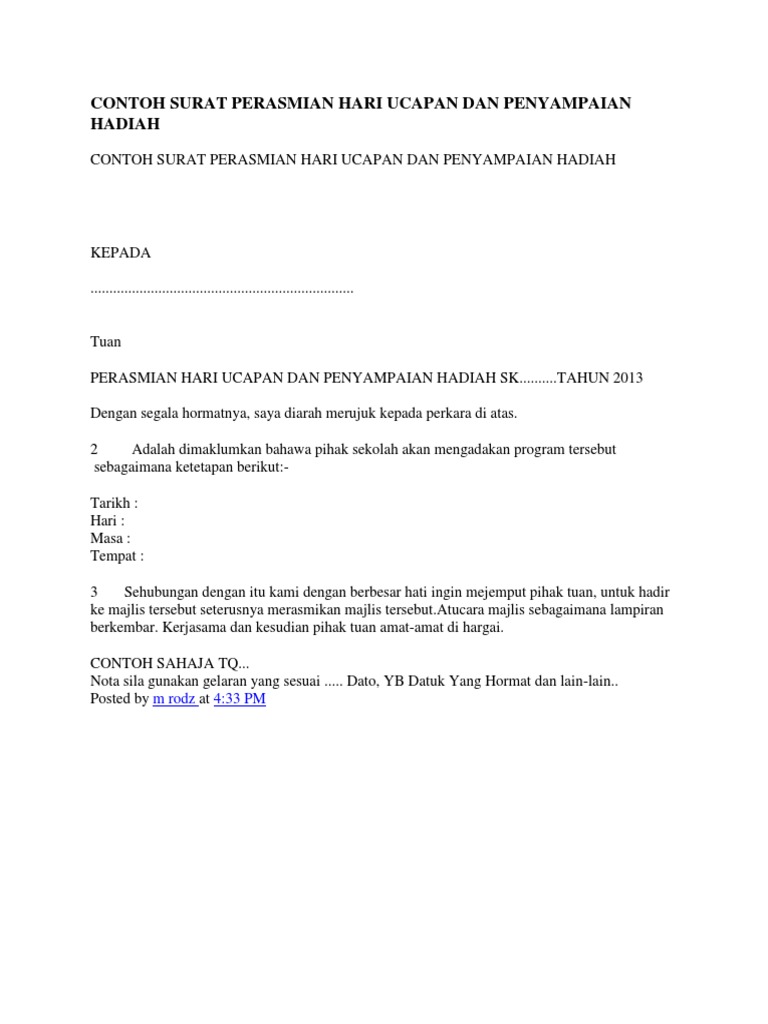 Contoh Surat Perasmian Hari Ucapan Dan Penyampaian Hadiah Pdf
