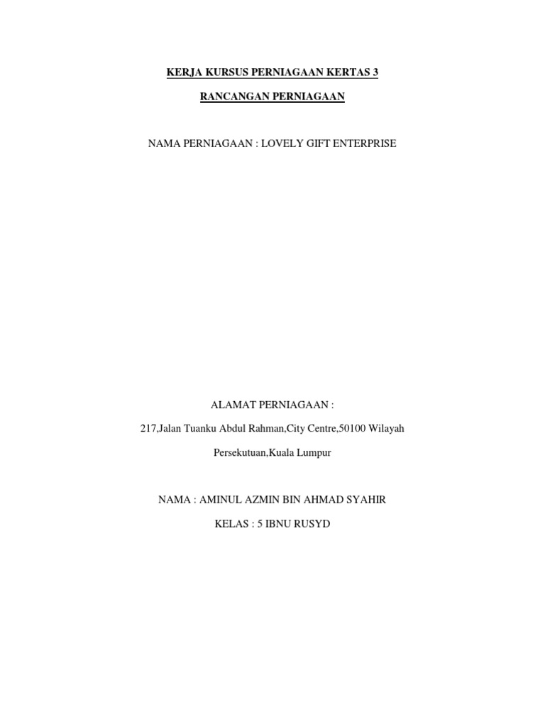 Kerja khusus perniagaan contoh pengenalan kerja kursus perniagaan tingkatan 5 food. Pelarasan utk soalan ini ialah mengikut kaedah 5 atas kos. Muka surat kandungan perlu menyenaraikan bahagian-bahagian utama dalam rancangan Perniagaan dan senarai lampiran serta bilangan muka surat yang.